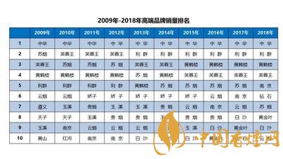 到2018年,「中華」銷量穩(wěn)定在135萬箱以上,市場(chǎng)份額保持在42%以上,「利群」以35萬箱銷量位居第2位,「黃鶴樓」接近25萬箱,「芙蓉王」、「南京」和「鉆石」突破10萬箱。和2009年相比,10萬箱以上品牌從3個(gè)增加到7個(gè),5萬箱以上從1個(gè)增加到7個(gè),萬箱以上品牌達(dá)到11個(gè),市場(chǎng)的成長(zhǎng)性與品牌的爆發(fā)力形成了線性的相得益彰。