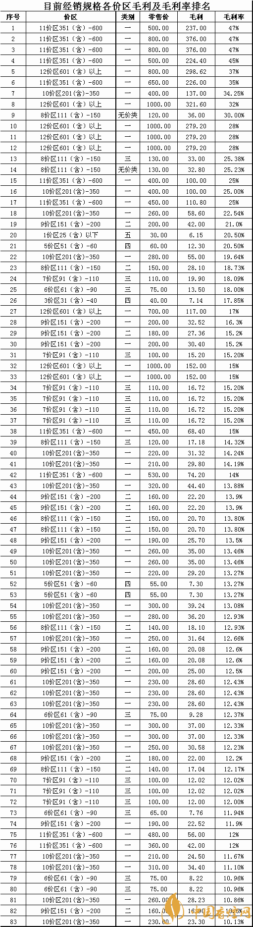 注:從目前全市經(jīng)銷的83個品牌批零差價可以看出,單品牌規(guī)格毛利率低于11%的僅有5個規(guī)格且全部高于10%的毛利率,部分溢價的規(guī)格產(chǎn)品毛利率已經(jīng)接近了50%,卷煙規(guī)格的平均毛利率達(dá)到了17.97%,然而這都預(yù)期的毛利,為什么真實(shí)的現(xiàn)狀是我們賺不到這應(yīng)該屬于我們自己的毛利率和毛利,是值得每一個卷煙經(jīng)營者深思和考慮的問題?為了保障大家的合法利益我們隱藏了商品名稱和商品編碼,有經(jīng)驗(yàn)的零售客戶對照價區(qū)和商品獲利水平就可以清晰的對商品進(jìn)行定位,具體對應(yīng)商品規(guī)格請參照2019版《卷煙零售客戶服務(wù)手冊》卷煙價格一覽表有詳解。