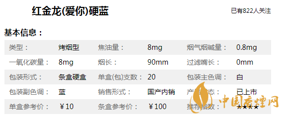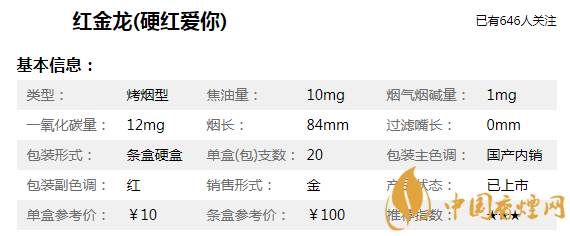 紅金龍(愛你)硬藍(lán)煙身長90mm,焦油含量僅為8mg/支,煙支修長雅致、煙氣淡雅醇厚、口感醇和細(xì)膩。帶給品吸者新鮮有趣的吸食體驗和適中的滿足感。吸食口感上,和南京炫赫門比較相似,低焦、低危害對身體危害也要低一些。只不過目前部分地區(qū)已經(jīng)買不到該款煙了,消費者要注意甄別真假,以免上當(dāng)受騙。