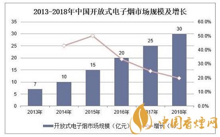 據(jù)統(tǒng)計(jì),2018年中國(guó)開(kāi)放式電子煙市場(chǎng)規(guī)模為30億元,同比增長(zhǎng)20%。