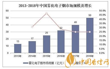 據(jù)統(tǒng)計(jì),2013-18年國(guó)內(nèi)霧化煙市場(chǎng)規(guī)模CAGR為+30%,2018年國(guó)內(nèi)霧化電子煙市場(chǎng)規(guī)模約50億元,同比增長(zhǎng)25%。