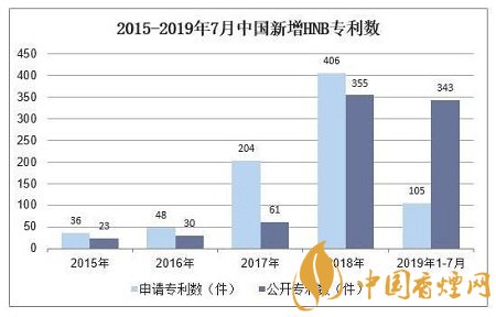 2016-2018年國(guó)內(nèi)HNB專(zhuān)利共計(jì)830件,其中2017年、2018年、2019年1-7月年新增HNB卷煙專(zhuān)利數(shù)(公開(kāi)口徑)分別約為61件、355件、343件,技術(shù)推進(jìn)加快。