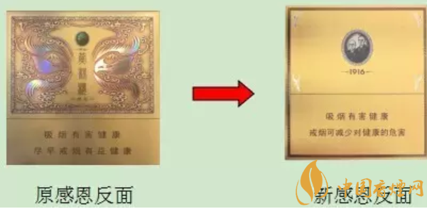 設計改版:黃鶴樓1916感恩香煙整體顏色改為鎏金色彩,反面圖案進行了簡化,畫面僅有南洋兄弟頭像和“1916”標識,盒型由原來的橫推升級為全開。