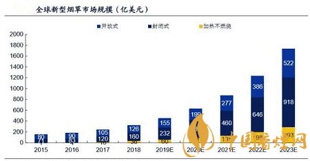 與傳統(tǒng)卷煙市場衰退呈鮮明對比的是新型煙草市場規(guī)模的逐年提升。全球新型煙 草市場規(guī)模以 27.9%的復合年增長率從 2013 年的 94 億美元迅速增加至 2018 年的 323 億美元。弗若斯特沙利文預計到 2023 年全球新型煙草市場規(guī)模將高達 1734 億美元。新型煙草煙作為一種替代香煙的電子產品,有著與香煙類似的外 觀、煙霧、味道和感覺。而與香煙相比卻不含有香煙煙霧中的 7000 種有害化學 成分,因此受到越來越多人的青睞。