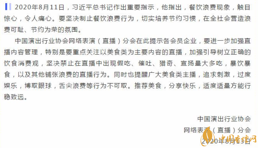 據(jù)中國演出行業(yè)協(xié)會官方微信消息,中國演出行業(yè)協(xié)會網絡表演 ( 直播 ) 分會在此提示各會員企業(yè),要進一步加強直播內容管理,特別是要重點關注以美食類為主要內容的直播,加強引導樹立正確的飲食消費觀,堅決禁止在直播中出現(xiàn)假吃、催吐、獵奇、宣揚量大多吃,暴飲暴食,以及其他鋪張浪費的直播行為。同時也提醒廣大美食類主播,追求刺激,過度娛樂,博取眼球,舌尖浪費等行為不可取。推薦美食,分享快樂,適度適量方能行穩(wěn)致遠。