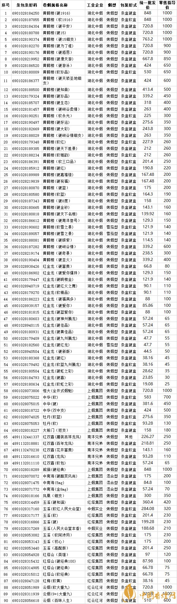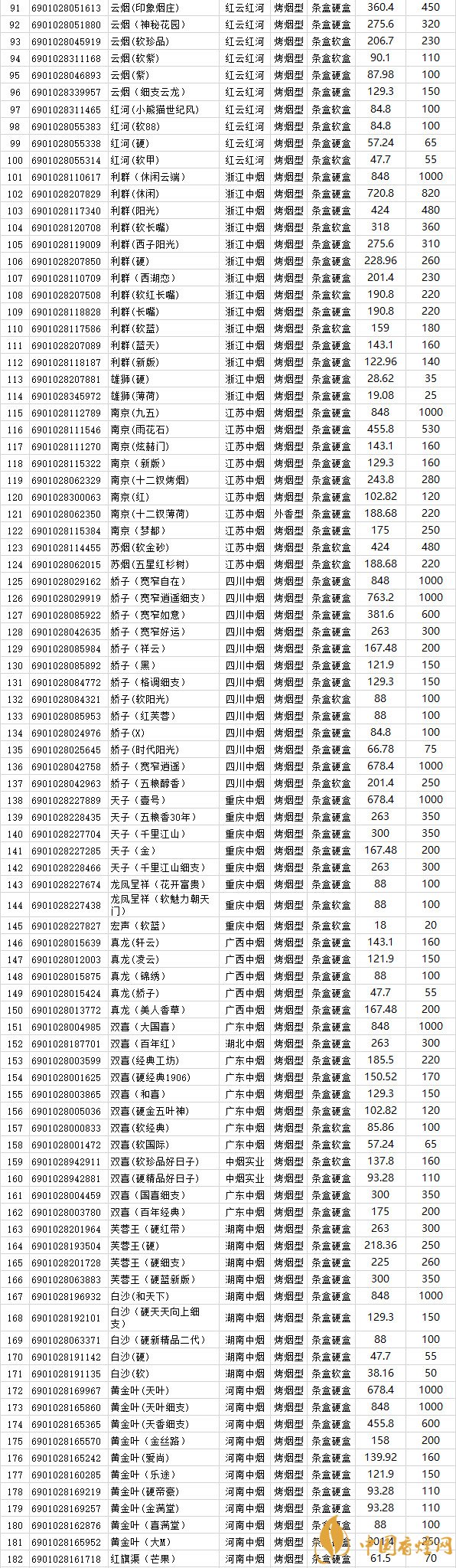 2018年卷煙銷售湖北地區(qū)271種 2018年上半年湖北省卷煙價格目錄