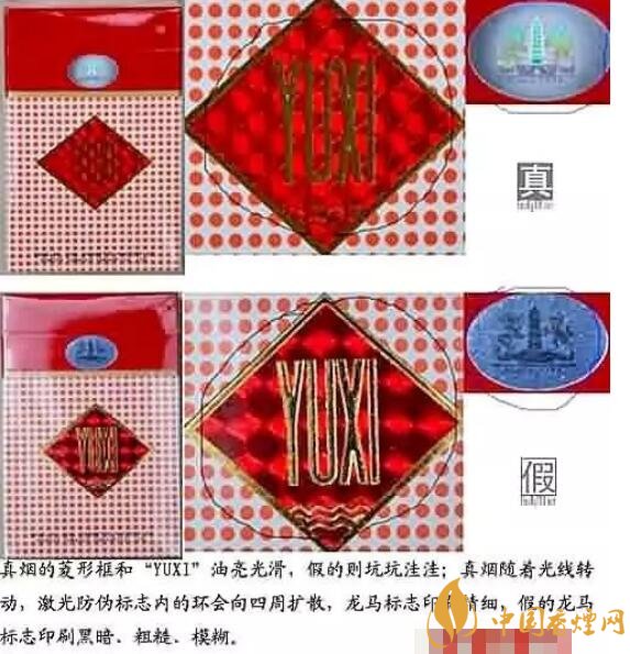 2.外包裝上的“YUXI”標(biāo)識,真的玉溪煙該標(biāo)識從不同角度觀察,呈現(xiàn)出不同的圖形,且?guī)缀螆D形完整,邊緣規(guī)則整齊;反之則為假煙。