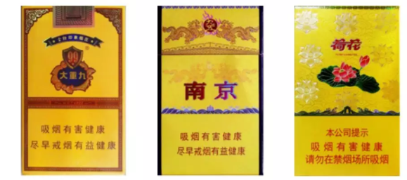 在中國(guó)傳統(tǒng)審美中,富貴金色是權(quán)貴階層的代表色彩,那么,高端香煙頻繁出現(xiàn)金色包裝就不足為奇了。2018卷煙流行色的從以下幾款就可以看出:例如,云煙(大重九)、南京(九五之尊)、鉆石(金一品荷花)等。