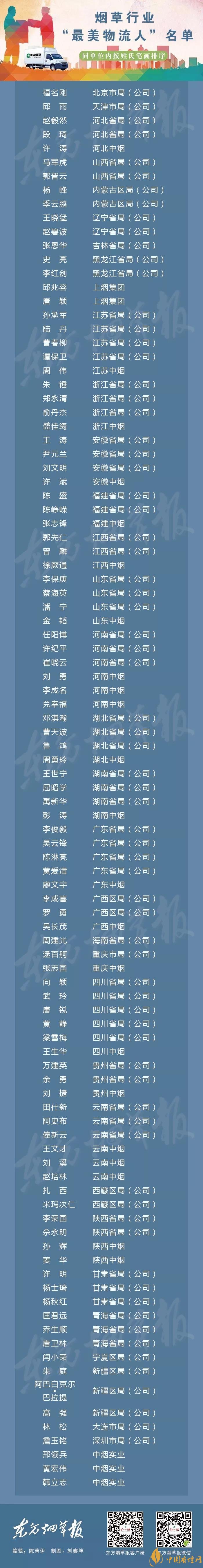 以上就是香煙網(wǎng)小編為大家整理介紹的關(guān)于2018100名基層員工獲評(píng)最美物流人名單相關(guān)信息,更多了解點(diǎn)擊:2018細(xì)支煙質(zhì)量抽查南京(雨花石)奪冠:一價(jià)類綜合質(zhì)量第一