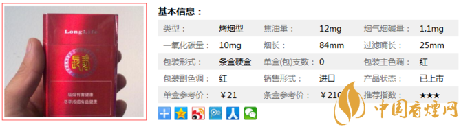 長壽香煙紅的售價(jià)為21元/包,特別的烤煙味道,它和國內(nèi)的這些21元檔的香煙完全不是一個(gè)概念。