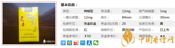 | 類型 :烤煙型 | 焦油量 :12mg | 煙氣煙堿量 :1mg | 一氧化碳量 :12mg |