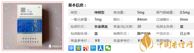 北戴河硬混5mg煙長84mm,屬于低焦油香煙,煙氣較淡,入口輕柔,是一款比較低害的香煙。想開始慢慢戒煙的煙友可以嘗試一下這款香煙。下面我們一起來看北戴河硬混5mg的參數(shù)信息:焦油量:5mg 煙堿量:0.5mg 一氧化碳量:7mg