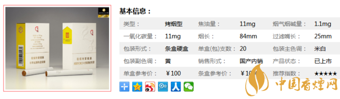 | 類型 :烤煙型 | 焦油量 :11mg | 煙氣煙堿量 :1.1mg | 一氧化碳量 :11mg |