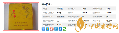 類型 :烤煙型 焦油量 :8mg 煙氣煙堿量 :1mg 一氧化碳量 :8mg