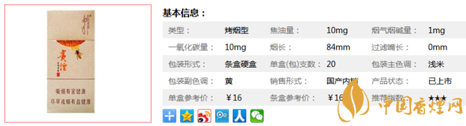 | 類型 :烤煙型 | 焦油量 :10mg | 煙氣煙堿量 :1mg | 一氧化碳量 :10mg |