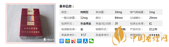 類型 :烤煙型 焦油量 :10mg 煙氣煙堿量 :1mg 一氧化碳量 :12mg