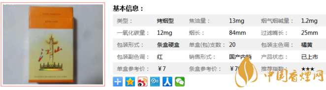 “江山”牌低危害卷煙通過科學(xué)的配方手段;利用先進(jìn)的添加技術(shù),添加了大量的名貴中草藥提取液,每支煙中含有0.5%的“仙芪補(bǔ)腎顆粒”新型料液,它是由精選的淫羊藿、白芍、仙茅、黃芪、柴胡等多味中草藥嚴(yán)格按照現(xiàn)代制藥技術(shù)精練濃縮而成下面我們一起來看江山精品的參數(shù)信息:焦油量:13mg. 煙堿量:1.2mg. 一氧化碳量:12mg.