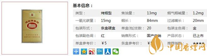類型 :烤煙型 焦油量 :13mg 煙氣煙堿量 :1.2mg 一氧化碳量 :15mg