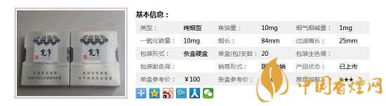 | 類型 :烤煙型 | 焦油量 :10mg | 煙氣煙堿量 :1mg | 一氧化碳量 :10mg |