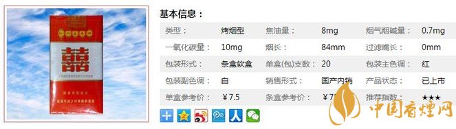 外觀非常喜慶,也比較懷舊。第一口吸下去,感覺非常順口,一點也不辣喉嚨,而且越吸越有味道,有一股淡淡的話梅香氣,口味回甘,煙氣很順。在質(zhì)量上保持原有紅雙喜卷煙風格和香氣特征,香氣更細膩,吸味更醇厚,且富有層次感,勁頭適中,刺激性小。