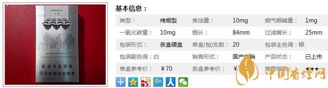 | 類型 :烤煙型 | 焦油量 :10mg | 煙氣煙堿量 :1mg | 一氧化碳量 :10mg |