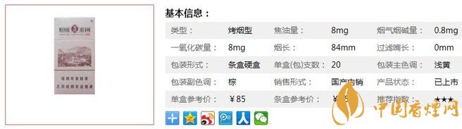 | 類型 :烤煙型 | 焦油量 :8mg | 煙氣煙堿量 :0.8mg | 一氧化碳量 :8mg |