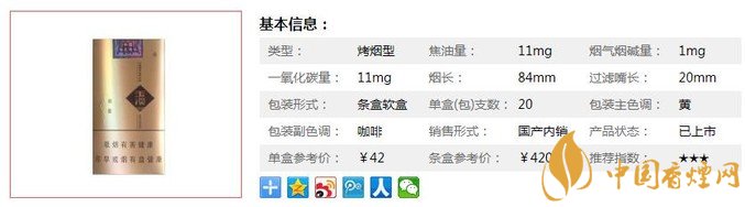類型 :烤煙型 焦油量 :11mg 煙氣煙堿量 :1mg 一氧化碳量 :11mg