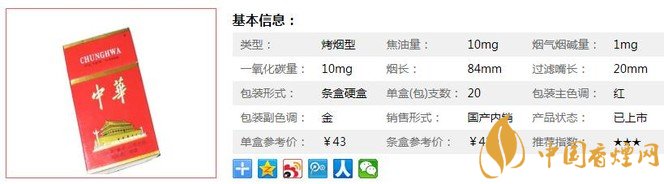 中華硬10mg煙支長84mm,過濾嘴長20mm,土黃色的過濾嘴上打著兩排細小的靜電孔,很不容易察覺。接近水松紙的下方印著紅色的中英文品名及華表,采用的還是典型的橫紋松紋紙,不過在煙支的末端印著數(shù)字‘118’。下面我們一起來看中華硬10mg的參數(shù)信息:焦油量:10mg. 煙堿量:1mg. 一氧化碳量:10mg.