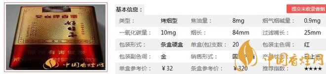 類型 :烤煙型 焦油量 :8mg 煙氣煙堿量 :0.9mg 一氧化碳量 :10mg