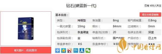 鉆石硬藍(lán)新一代煙支長(zhǎng)84mm,采用特色分組加工、分類(lèi)加料技術(shù),加工過(guò)程充分運(yùn)用柔性加工技術(shù)與重點(diǎn)工序控制參數(shù)組合技術(shù),實(shí)現(xiàn)了煙絲物理性能與化學(xué)物質(zhì)的最優(yōu)化,每一個(gè)細(xì)節(jié)只為帶來(lái)舒適輕松感受。下面我們一起來(lái)看鉆石硬藍(lán)新一代的參數(shù)信息:焦油量:8mg 煙堿量:0.8mg 一氧化碳量:10mg