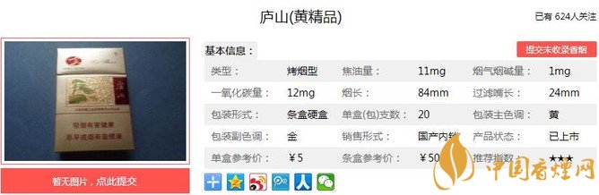 廬山黃精品煙葉選料考究。以全國著名煙葉品牌“紫石”為主要原料,產地出自高海拔山區(qū),日照時間長、天然無污染。經香煙網小編市場調查廬山黃精品售價為5元/包。