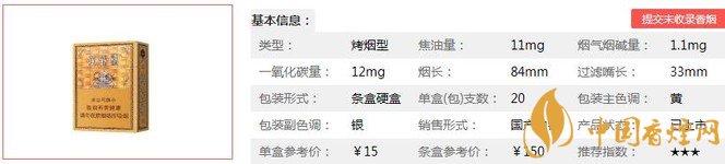 | 類型 :烤煙型 | 焦油量 :11mg | 煙氣煙堿量 :1.1mg | 一氧化碳量 :12mg |