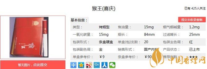 猴王(喜慶)是在原猴王(磨砂)產(chǎn)品風(fēng)格特點的基礎(chǔ)上經(jīng)全新改造而成的中高檔卷煙產(chǎn)品。煙支方面采用33g/m2、60CU豎紋卷煙紙、25mm長度濾棒,在保證煙草的味道的同時有效降低焦油的的危害,充分體現(xiàn)了喜慶的環(huán)保意識。下面就由香煙網(wǎng)小編帶大家一起來了解猴王喜慶的相關(guān)信息。