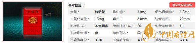 類型 :烤煙型 焦油量 :13mg 煙氣煙堿量 :1.2mg 一氧化碳量 :13mg