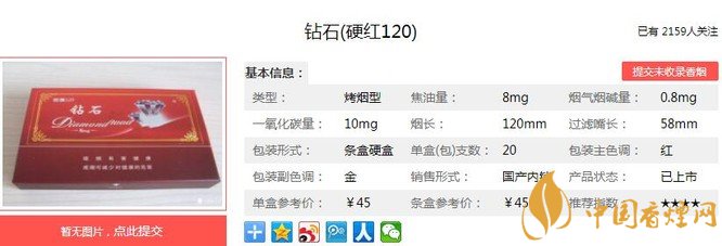 對所有原料進行科學的理化分析,選用了香氣足、煙堿高、焦油低的巴西、津巴布韋及國內(nèi)優(yōu)質(zhì)且自然醇化的煙葉。香煙價位中等,質(zhì)量比較不錯,在市場上獲得高端消費者的認同和追捧。經(jīng)香煙網(wǎng)小編市場調(diào)查鉆石硬紅120售價為45元/包。