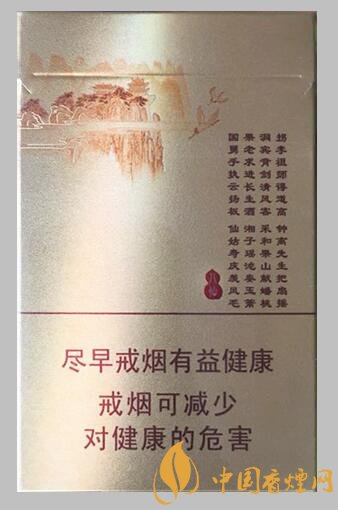 煙盒正面翻蓋處的八仙過海四字的設(shè)計(jì),有些與金圣的滕王閣相似。主圖為騰云駕霧的老哥八個(gè),應(yīng)該屬于線條畫的類型。警示語句為最新版本。整體為三段,最上段為燙金畫面,顏色與最下面部位相同。煙盒背面采用七言律詩的格式,簡介了八仙各自的特點(diǎn)。整體包裝十分有神韻。