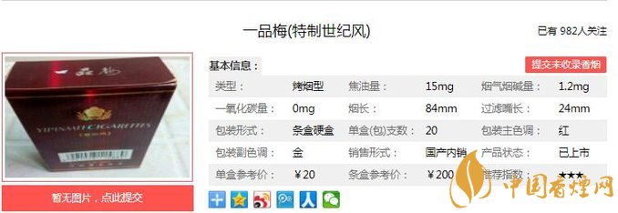 品梅世紀(jì)風(fēng)煙氣甜韻圓潤、柔綿舒適、入喉清新豐滿、順暢、醇綿、飽滿、輕靈,此煙還是很不錯(cuò)的,口感著實(shí)純正飽滿,醇厚干凈。經(jīng)香煙網(wǎng)小編市場調(diào)查一品梅世紀(jì)風(fēng)售價(jià)為20元/包。