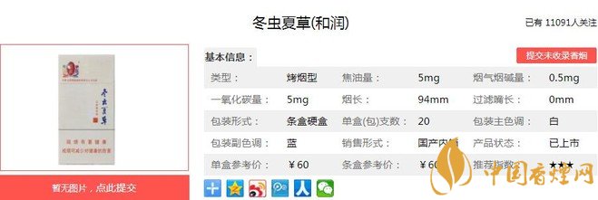 冬蟲夏草(和潤)煙支長:97mm,烤煙型,包裝形式:條盒硬盒(每盒 20支,每條 10 盒)。煙嘴長:5mm。用云南優(yōu)質(zhì)煙葉為主料,配以福建、貴州等地的上等煙葉,經(jīng)過嚴(yán)格的原料挑選、精細(xì)加工,使煙絲色澤油潤光鮮。下面我們一起來看冬蟲夏草(和潤)的參數(shù)信息:焦油量:5mg 煙堿量:0.5mg 一氧化碳量5mg