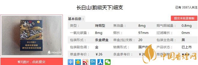長(zhǎng)白山韻藏天下細(xì)支煙支長(zhǎng)97mm,專有的沉香活性成分制備技術(shù)及沉香載體柔性加工技術(shù),保障了香氣釋放量的均勻一致,吸煙過程更輕松。下面我們一起來(lái)看長(zhǎng)白山韻藏天下細(xì)支的參數(shù)信息:焦油量:8mg 煙堿量:0.8mg 一氧化碳量:8mg