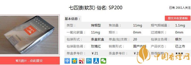七匹狼軟灰亦稱七匹狼(SP200),精選國(guó)內(nèi)外優(yōu)質(zhì)烤煙,人工片選精華,運(yùn)用國(guó)際先進(jìn)的無氟及過濾技術(shù)、HXD烘絲工藝,由全新的國(guó)際一流廠房和設(shè)備精工制作,氣質(zhì)卓越優(yōu)雅,品味自然純正,煙草本香流露無遺,是比較經(jīng)典的具有較高性價(jià)比的狼煙。經(jīng)香煙網(wǎng)小編市場(chǎng)調(diào)查七匹狼軟灰售價(jià)為21元/包。