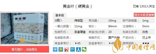 內在設計延續(xù)黃金葉濃香品類技術特色,突出 “醇香”風格,秉承“平衡與協調”設計理念,通過產品葉組配方設計、加香加料設計和卷煙材料的配套設計,注重保持產品香氣、濃度的同時,提高口感的舒適度和煙氣的輕松感。香氣醇和優(yōu)雅,煙氣凈甜舒爽,突出自然流暢,輕松愉悅。經香煙網小編市場調查黃金葉硬黃金售價為45元/包。