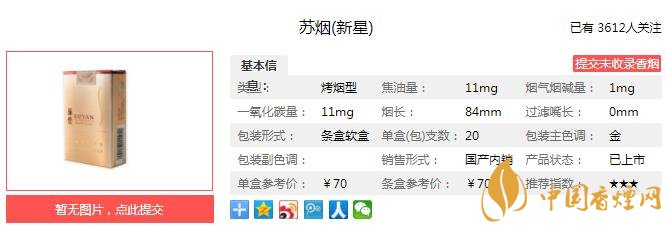 蘇煙(新星)和蘇煙(天星)是“蘇煙”全新推出的“星系列”的兩個原創(chuàng)型產(chǎn)品;這兩款“星系列”的主力規(guī)格共同承載“蘇煙”通過主銷價區(qū)向上延伸力爭實(shí)現(xiàn)提升品牌價值的戰(zhàn)略意義,并以此來鞏固和提升“蘇煙”在高端消費(fèi)者心目中所具有的“高端身份”的價值認(rèn)知。經(jīng)香煙網(wǎng)小編市場調(diào)查蘇煙新星售價為70元/包。