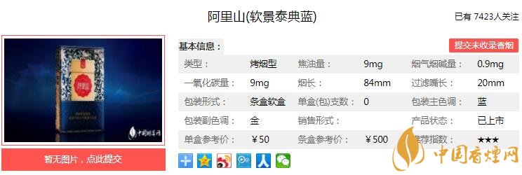 阿里山煙近幾年在國內(nèi)還是比較常見的,這款阿里山(軟景泰典藍)屬于這個系列的高端產(chǎn)品,嚴格遵循全手工選葉,不添加其他填充物,用物理方法提取純天然植物香料,不添加任何化學(xué)合成香。經(jīng)香煙網(wǎng)小編市場調(diào)查阿里山軟景泰典藍售價為50元/包。