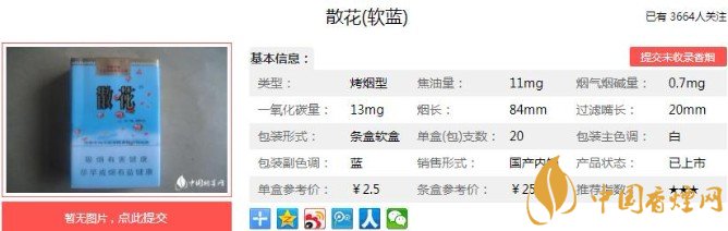 香煙上側(cè)的封標(biāo)印有河南中煙的字樣和LOGO ,內(nèi)襯紙為銀色。下側(cè)散花二字中間印有兩朵美麗的紅花。左側(cè)理化指標(biāo),右側(cè)條碼,都印有黃色花籃狀標(biāo)志。煙支7-6-7方式排列。黃色雪花濾嘴印有一粗一細(xì)兩道金色箍圈,煙支上印有花籃和花朵圖案,中間印有紅色散花漢字,將近占據(jù)煙支部分的二分之一。下面便是散花(軟藍)的基本參數(shù):焦油量:11mg 煙堿量:0.7mg 一氧化碳量:13mg.