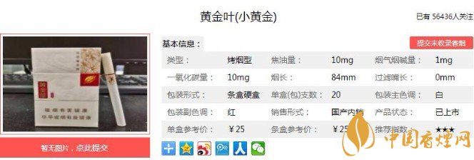 黃金葉(小黃金)包裝精致好看,于細(xì)微處見(jiàn)精彩,體現(xiàn)了產(chǎn)品的時(shí)尚亮點(diǎn)與現(xiàn)代科技成果的運(yùn)用??诟蟹矫?,吸阻適中,燃速均勻,基本上每一口煙氣都是飽滿滑潤(rùn),香氣濃郁。這樣的價(jià)格能有這樣的口感,可以說(shuō)是非常不錯(cuò)了,挑不出明顯的不足來(lái)。下面跟著香煙網(wǎng)小編一起來(lái)了解黃金葉(小黃金)的相關(guān)信息吧。