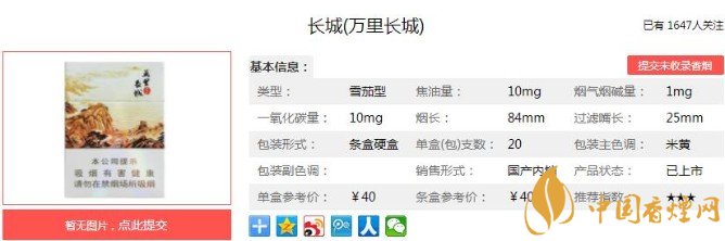 長城(萬里長城)采用特制嘴棒,雪茄的焦油量一般都標的是焦中,這款萬里長城卻標的是10mg,可以說是一大創(chuàng)新之處。下面便是長城(萬里長城)的基本參數(shù):焦油量:10mg 煙堿量:1.0mg 一氧化碳量:10mg.