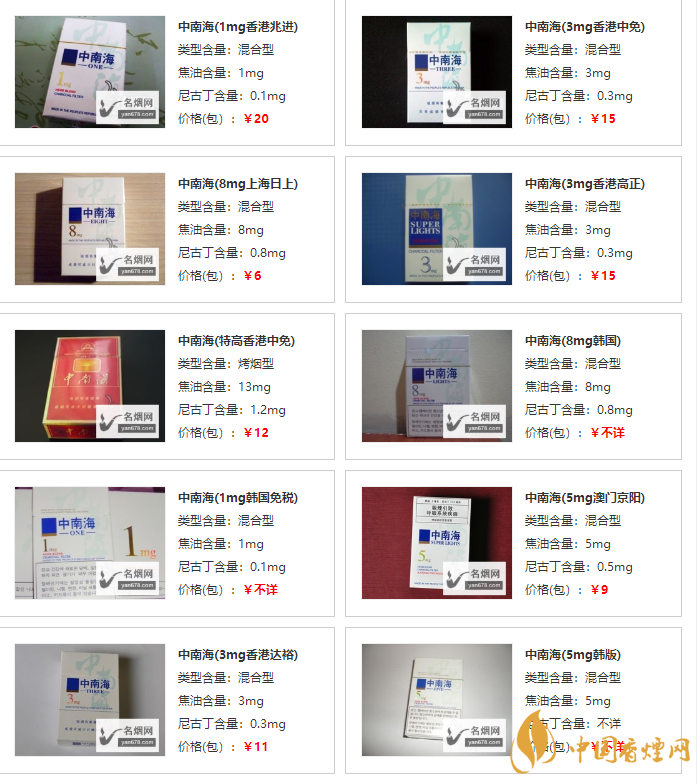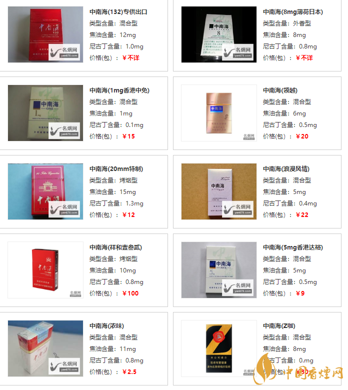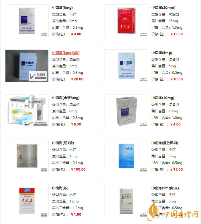 中南海香煙價格表