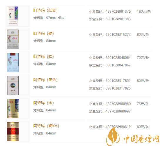 2020年阿詩(shī)瑪香煙價(jià)格表圖