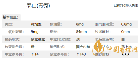 泰山青秀煙長84mm,屬于低焦油系列香煙,煙氣較淡,入口輕柔,煙勁挺小的外觀很大氣到喉嚨里后也很順暢在這個(gè)價(jià)位里是挺不錯(cuò)的一款煙了。下面我們一起來看泰山青秀的參數(shù)信息:焦油量:8mg煙堿量:0.8mg一氧化碳量:9mg。