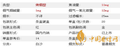 | 類型 :烤煙型 | 焦油量 :11mg | 煙氣煙堿量 :1mg | 一氧化碳量 :12mg |